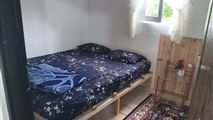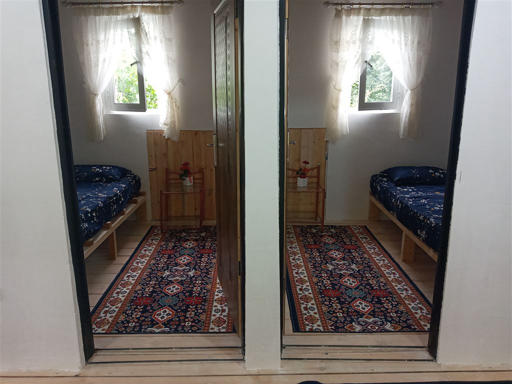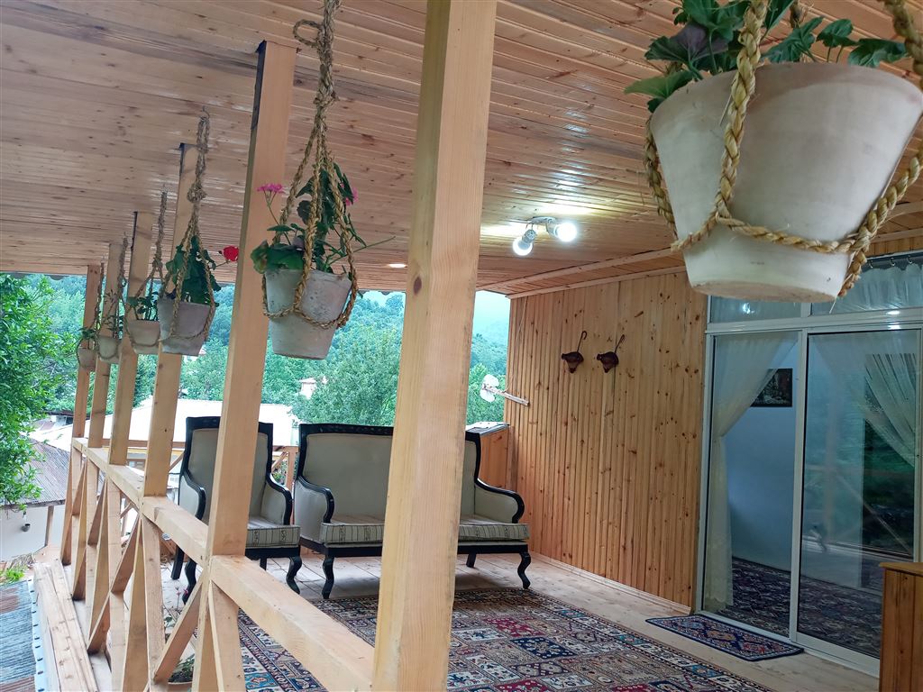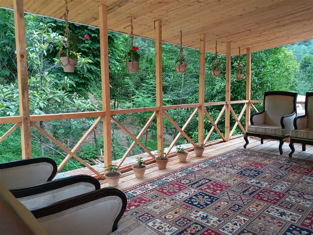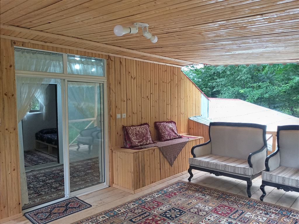 حیاط روبروی تراس چوبی کوچک هست و دورش حصارکشی شده بافنس هست و در واقع ادامه جنگل و کوهپایه هست که سراشیبی داره لطفا با باغ بزرگ و زمین صاف اشتباه نگیرید و از تراس چوبی به حیاط راه نداره و از پایین و با پله باید برید تو حیاط ولی در عوض جنگل خیلی قشنگ و بزرگی داره که راحت میتونید رفت و امد کنید و اختصاصی هست و محصولات محلی مثل نون و شیر و تخم مرغ و پنیر و غیره هم موجوده که میتونید راحت سفارش بدین، جای پارک برای ۴ تا ماشین هم داره.