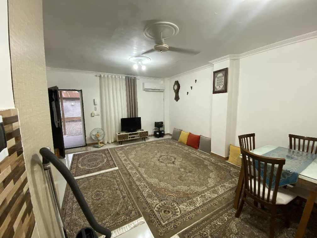 - اتاق پذیرایی دارای فرش و پشتی، تلویزیون و میز غذاخوری