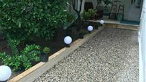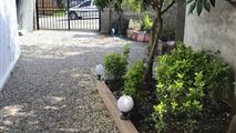 حیاط 150 متری دارای درخت، باغچه، گل و گیاه، منقل که به صورت اشتراکی با ویلای کناری استفاده میشود.
