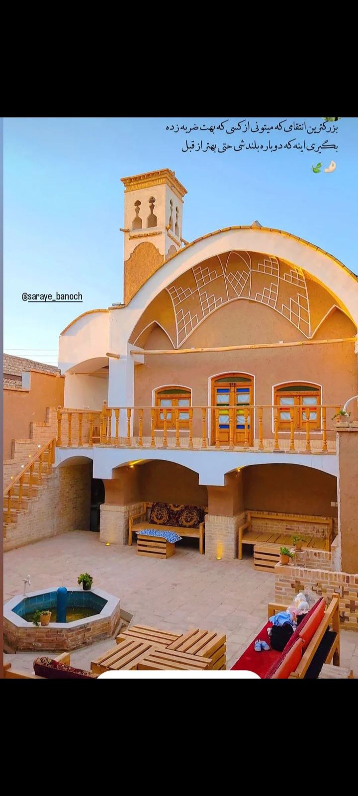 این اقامتگاه در بافت تاریخی شهر نوش آباد جنب ورودی ۲ شهر زیرزمینی در ۶ کیلومتری کاشان ۳۰ کیلومتری نیاسر و قمصر و در نزدیکی کویر مرنجاب و سیازگه و نوش آباد واقع شده فاصله ی سوپر مارکت و نانوایی و بانک و میوه فروشی به اقامتگاه ۲۰۰ متر میباشد