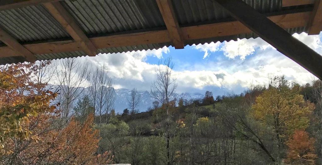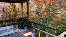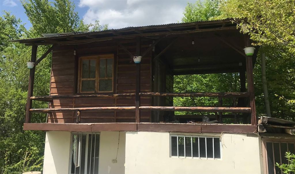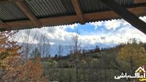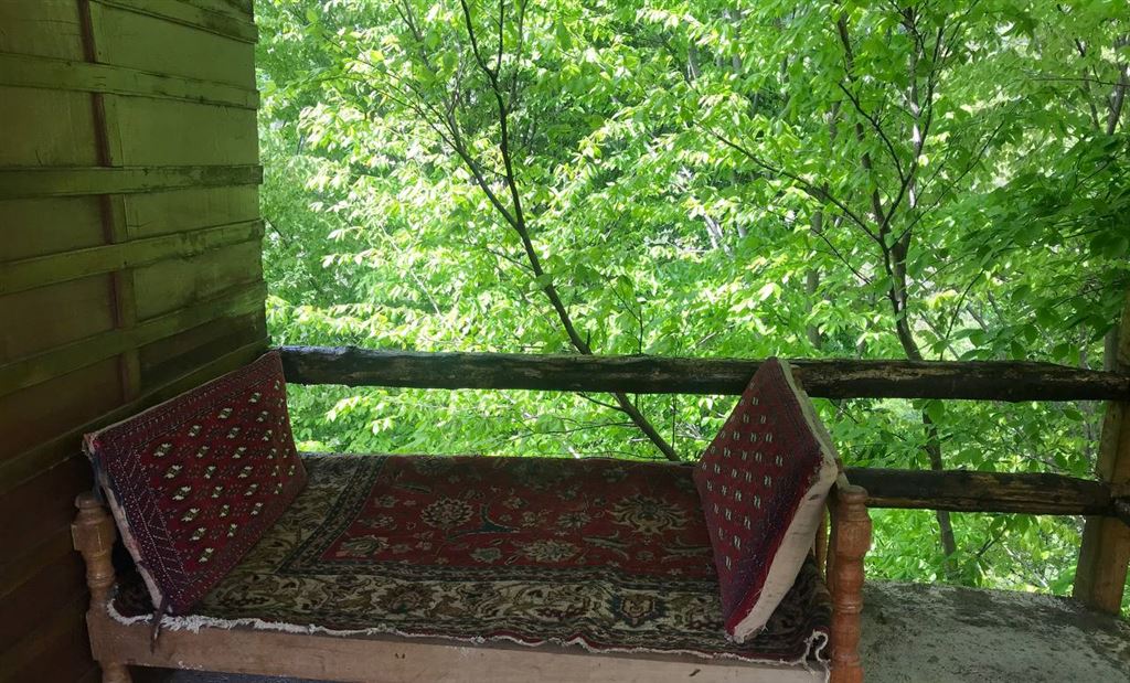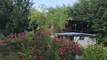 کلبه جنگلی چوبی در روستایی سنگده، محصور شده با درختان جنگلی و چشم اندازی از رشته کوه البرز، و دارای باغی بسیار زیبا با گل های متنوع، دور از منطقه روستایی، پر از ارامش و سکوت