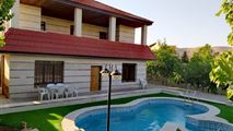 اجاره باغ ۲۵۰۰ متری با استخر بسیار زیبا با ویلای دوبلکس بسیار لوکس. سالن مبله لوکس و آشپزخانه شیک با تمام امکانات رفاهی و اقامتی (گیرنده دیجیتال. LCD. سرمایش و گرمایش. آبگرمکن. یخچال فریزر. اجاق گاز. لوازم آشپزی و...) سرویس فرنگی و ایرانی و حمام.